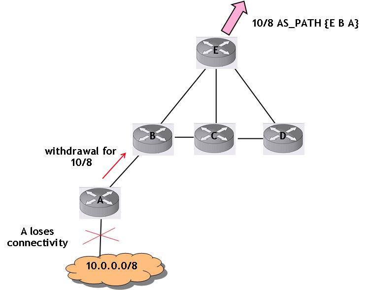 B runs its decision process and finds that there is no other route to 10/8, and thus sends an explicit withdrawal to its peers C and E.